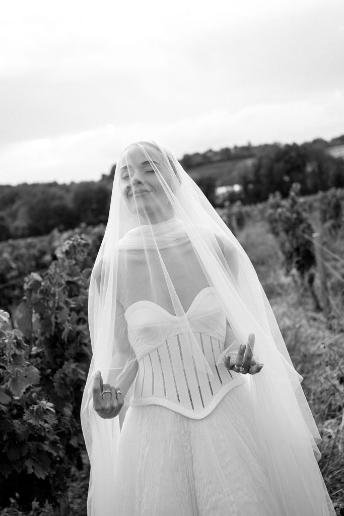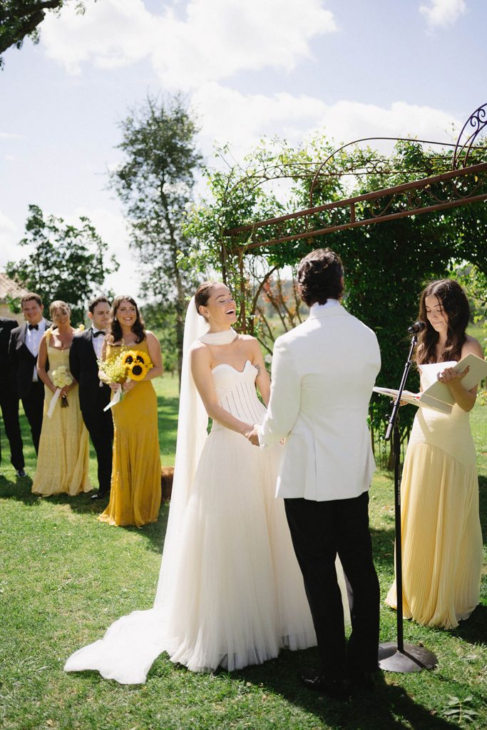 The ceremony unfolded under a golden sun in front of the vinyard, bathed in yellow from start to finish. The bridesmaids wore mismatched yellow dresses, each carrying her own bouquet, creating a joyful, sun-drenched palette around Sophia & William.